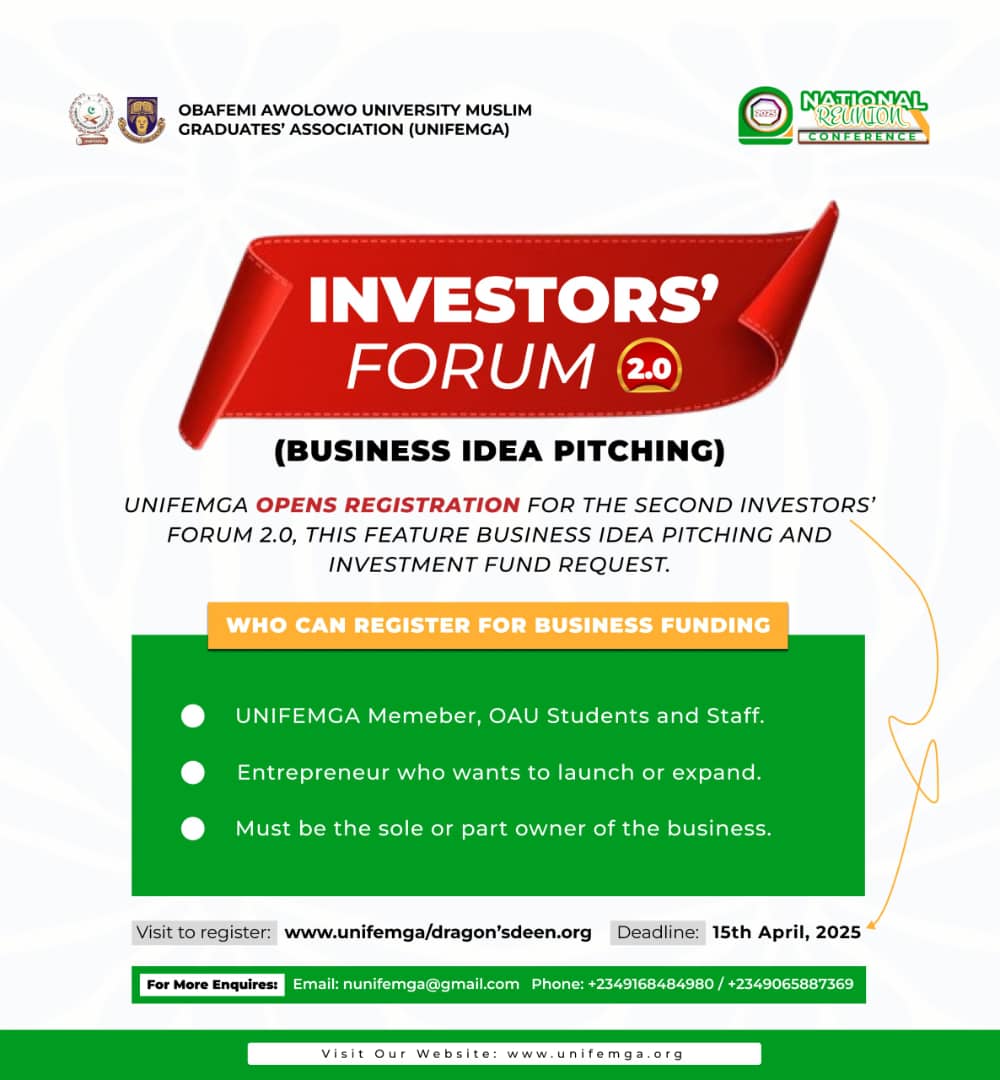 Are you an entrepreneur looking to get your service or product off the ground or to expand into different markets? UNIFEMGA investors Forum would be running another session during the Association’s 2025 Reunion Networking Dinner. The UIF is designed for UNIFEMGA Members and Associates and brings together Entrepreneurs and Halal Investors to ensure that Entrepreneurs get the best source of funding options that are not necessarily available from commercial banks and Cooperatives. UNIFEMGA would put together a team of Investors including the Abdulkabir Aliu Foundation (AAF) and the general UNIFEMGA family in a convenient atmosphere to review Entrepreneurs business pitches and take up offers of equity and or investments in the different Entrepreneur businesses.